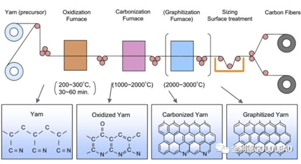②生产方式:碳纤维可通过高分子有机纤维的固相碳化或低分子烃类的气相热解来制取。目前世界上产生的销售的碳纤维绝大部分都是用聚丙烯腈纤维的固相碳化制得的。