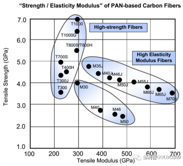 高性能CF(强度>2000MPa,模量>250GPa):高强度CF(HS):强度>2000MPa、高模量CF(HM):模量>300GPa、强CF(UHS):强度>4000MPa、模CF(UHM):模量>450GPa、高强-高模CF、中强-中模CF、高强高伸型:延伸率>2%
